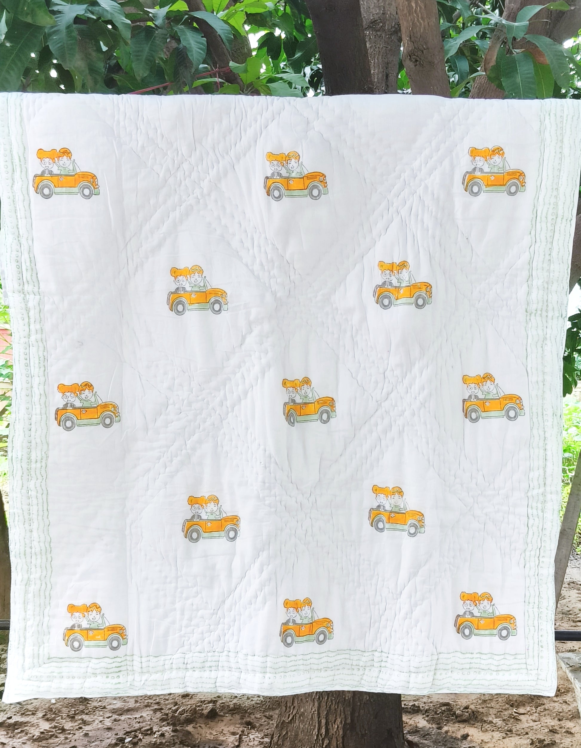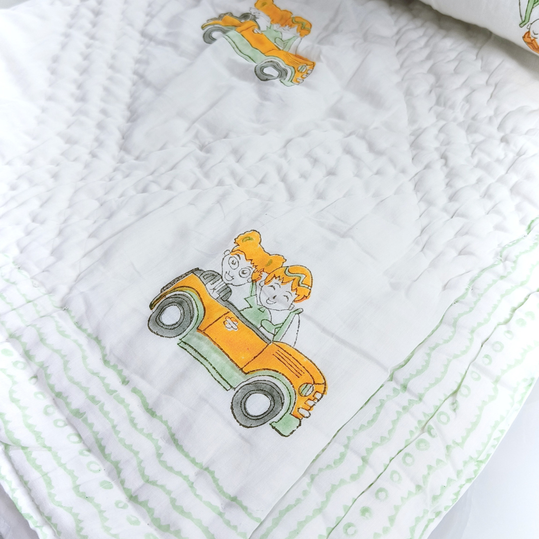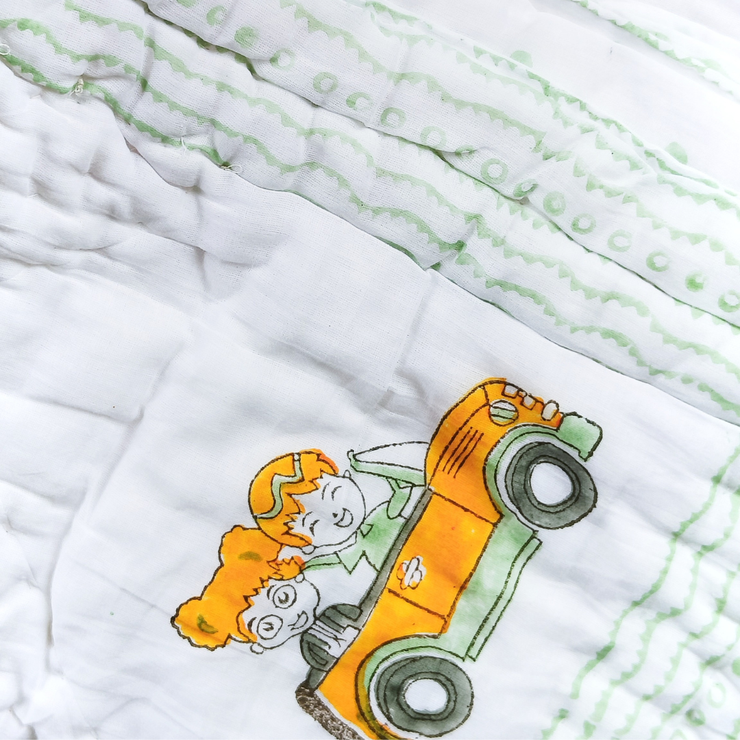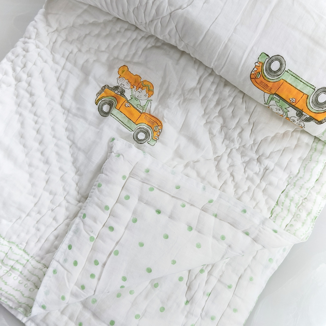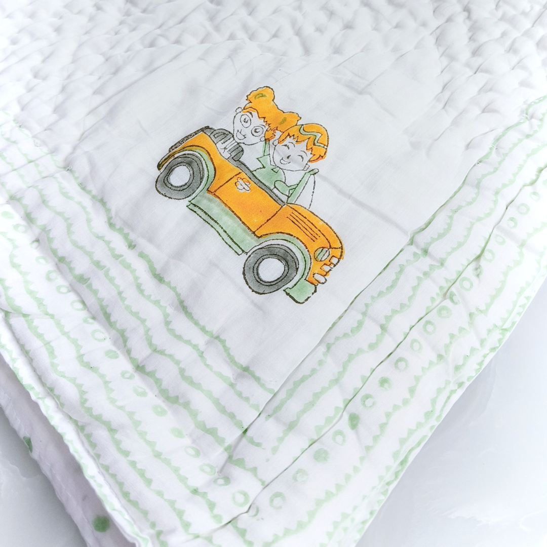 Soft, cuddly, and hand block printed with an adorable car design. Perfect for your little one's nursery or crib.