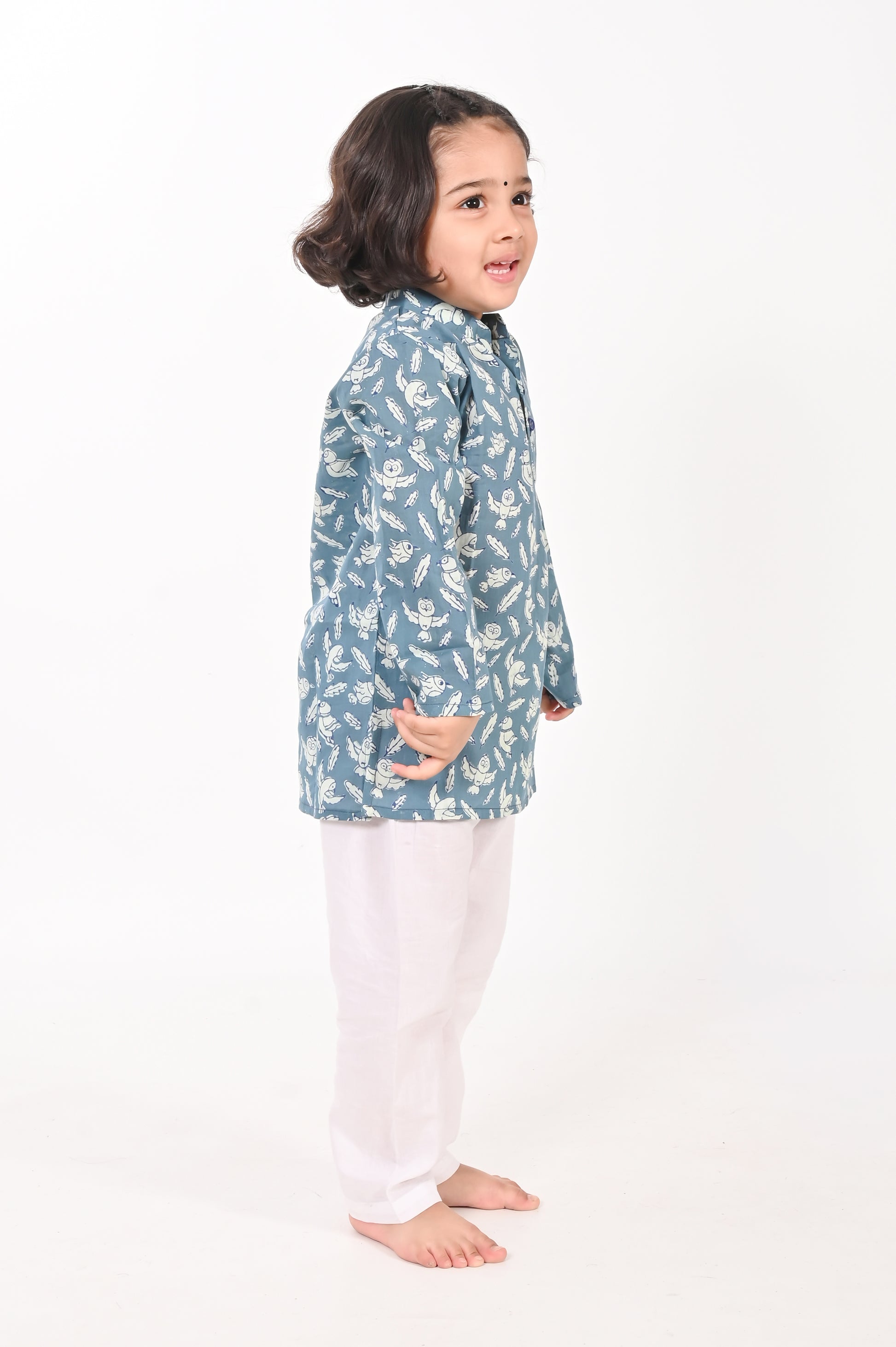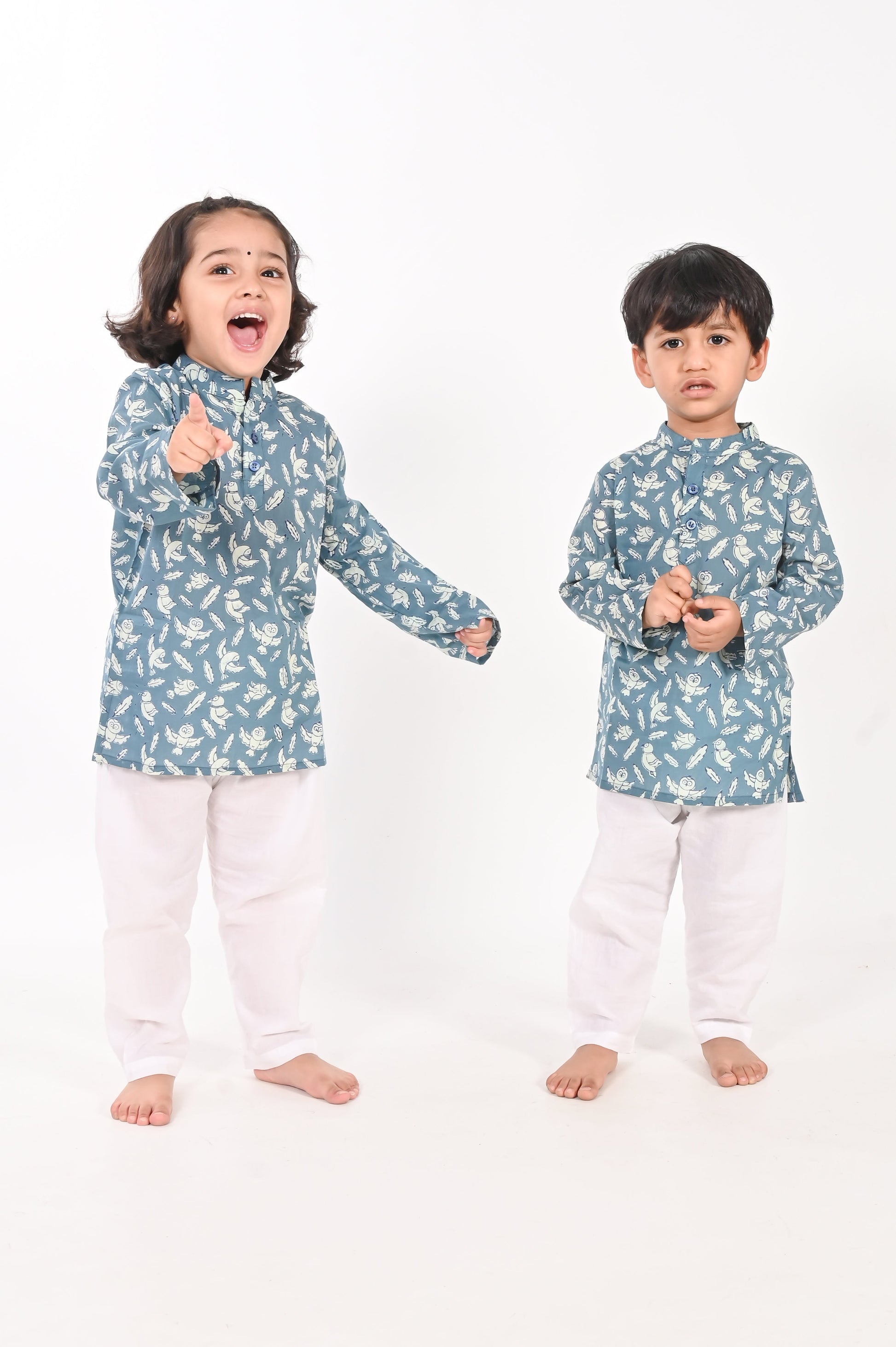Introducing Chidiya Udd, the perfect unisex kurta for boys and girls! Made with 100% cotton and featuring handblock printing, this versatile short kurta can be paired with jeans or pants for a stylish and comfortable look. Elevate your child's wardrobe with this must-have piece.