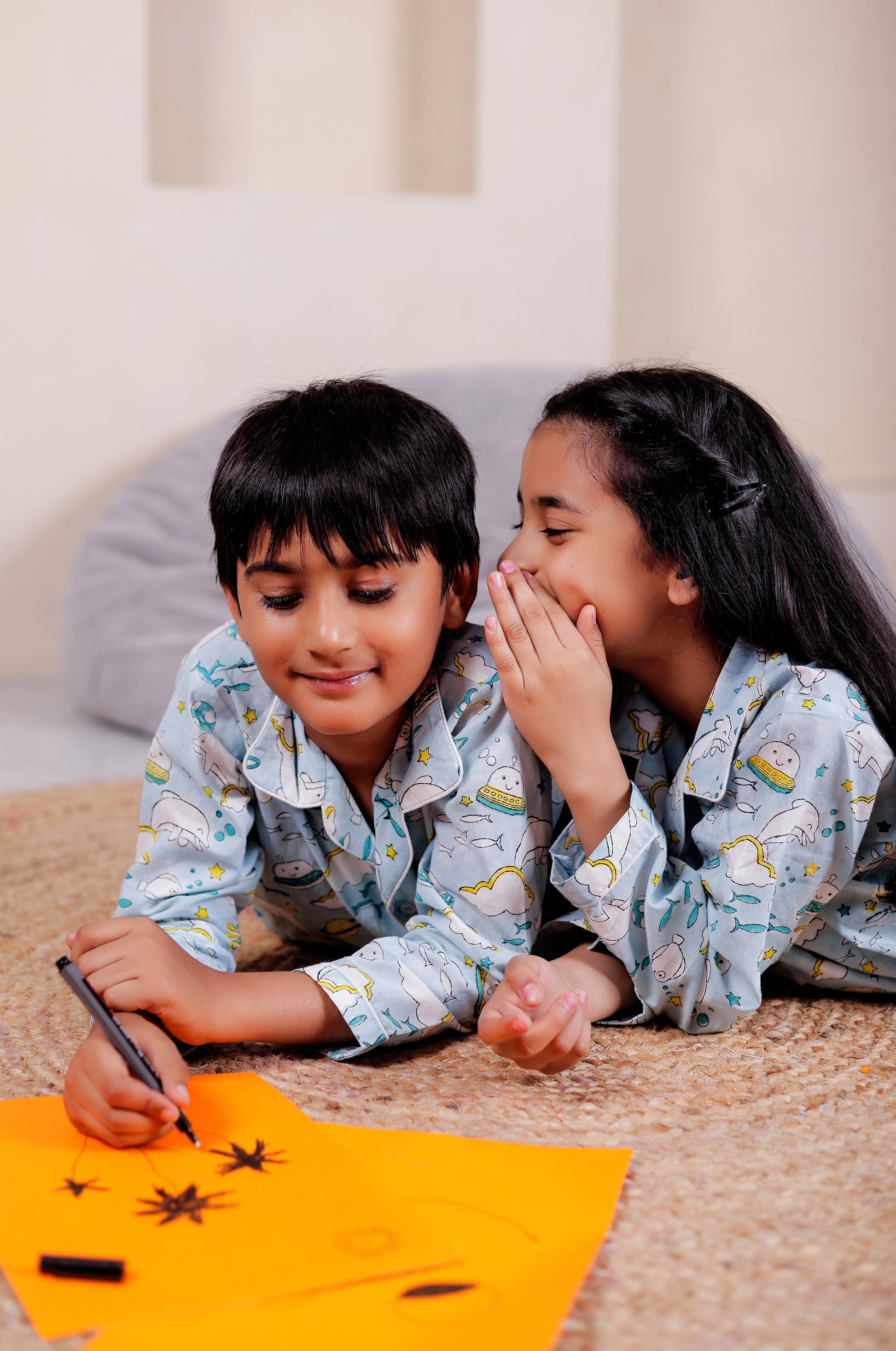 Playful Fish Print Blue  cotton Nightsuit Sets for kids  | Twins Matching Sleepwear for kids
