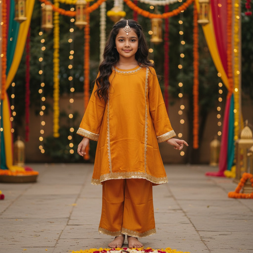 The comfortable palazzo or flared pant ensures ease of movement, making it ideal for your little one to twirl and play in golden hues.